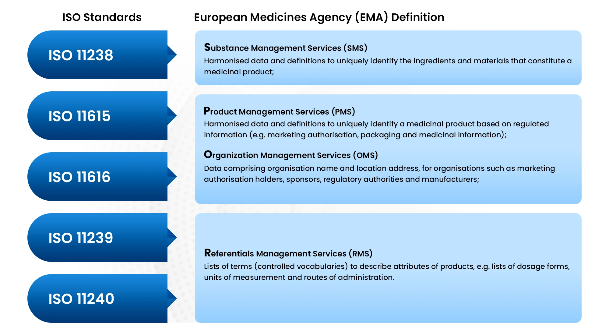 IDMP consists of five distinct standards, each defining concepts, data elements, and their structural relationships.