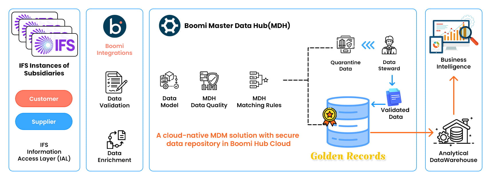 For example, building data pipelines to push the golden records into a data warehouse for analytics and to generate business intelligence reporting to support informed decision making.