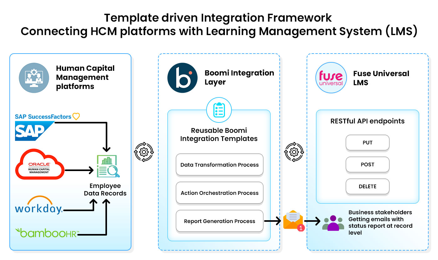 Reusability and Adaptability were the 2 significant factors considered in the integration architecture and design. Our integration architects assessed the commonalities of the HCM user profiles across various HCM systems, and a generic, canonical data model was designed. The data flow through the integration process was divided into different processing stages. The architectural & design deliverable was an E2E integration template to build integration processes that connect to any HCM system and Fuse Universal’s system API(s).